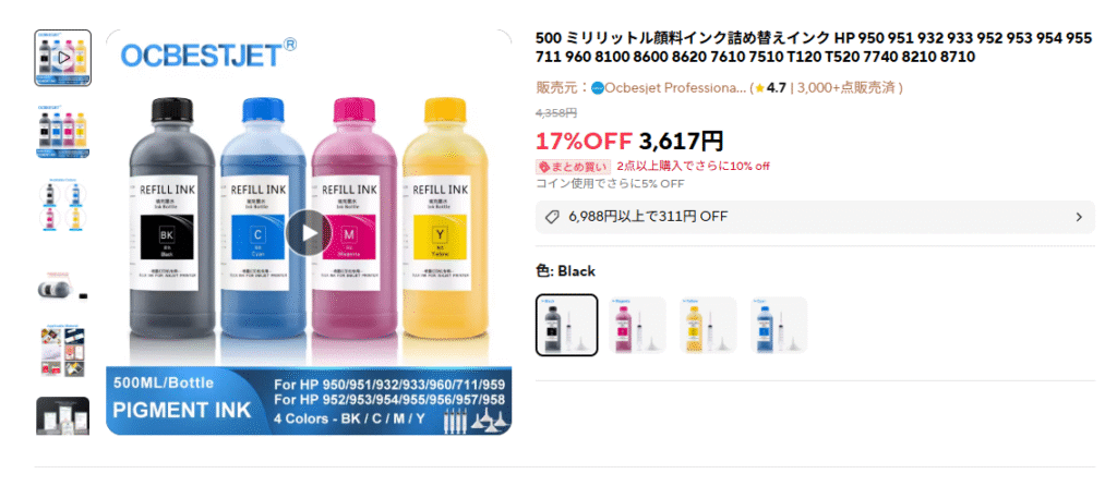 OCBESTJETというメーカーのもののようだ。多くインクを出しているので、直感で信じていいのではないかと思った。また、販売点数もとても多い。これを4色すべて注文した。
